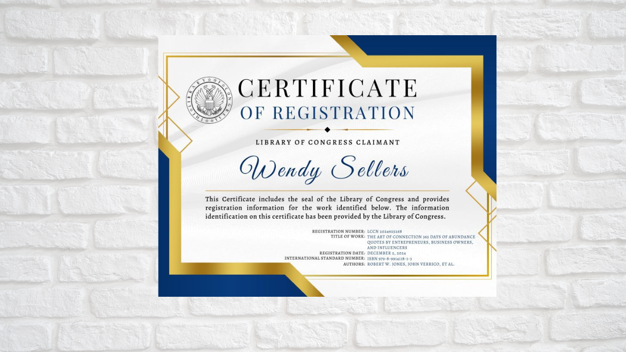 PS: My work as a contributing author of “The Art of Connection, 365 Days of Abundance” has been recognized and curated by the Library of Congress and preserved in the U.S. Copyright Office – from my desk to the nation’s library!